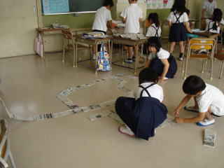 ![]() 「さあ、完成だ!教室いっぱいに新聞紙をつないで なが〜い、なが〜い道路ができあがったよ!!」 |