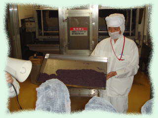大きな機械であっという間に「ゆかり」の完成です。 出来たてのゆかりはとってもおいしそうです♪ ![]() |