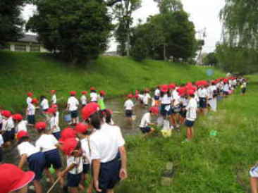 | 生活科の活動で、川に行きました。みんな、あみや、バケツを手に持って、水辺の生き物をさがしたり、川の中を走り回ったり。しっかり、川を探検できました。 |