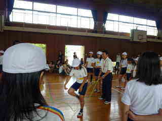 | 9月9日、Loginさんを招いて6年生のPTCがありました。 初めてダブルダッチの跳び方を見て、びっくり!!「跳んでみたいなあ。」と気持ちが高まりました。回し方も難しそうです。 | |